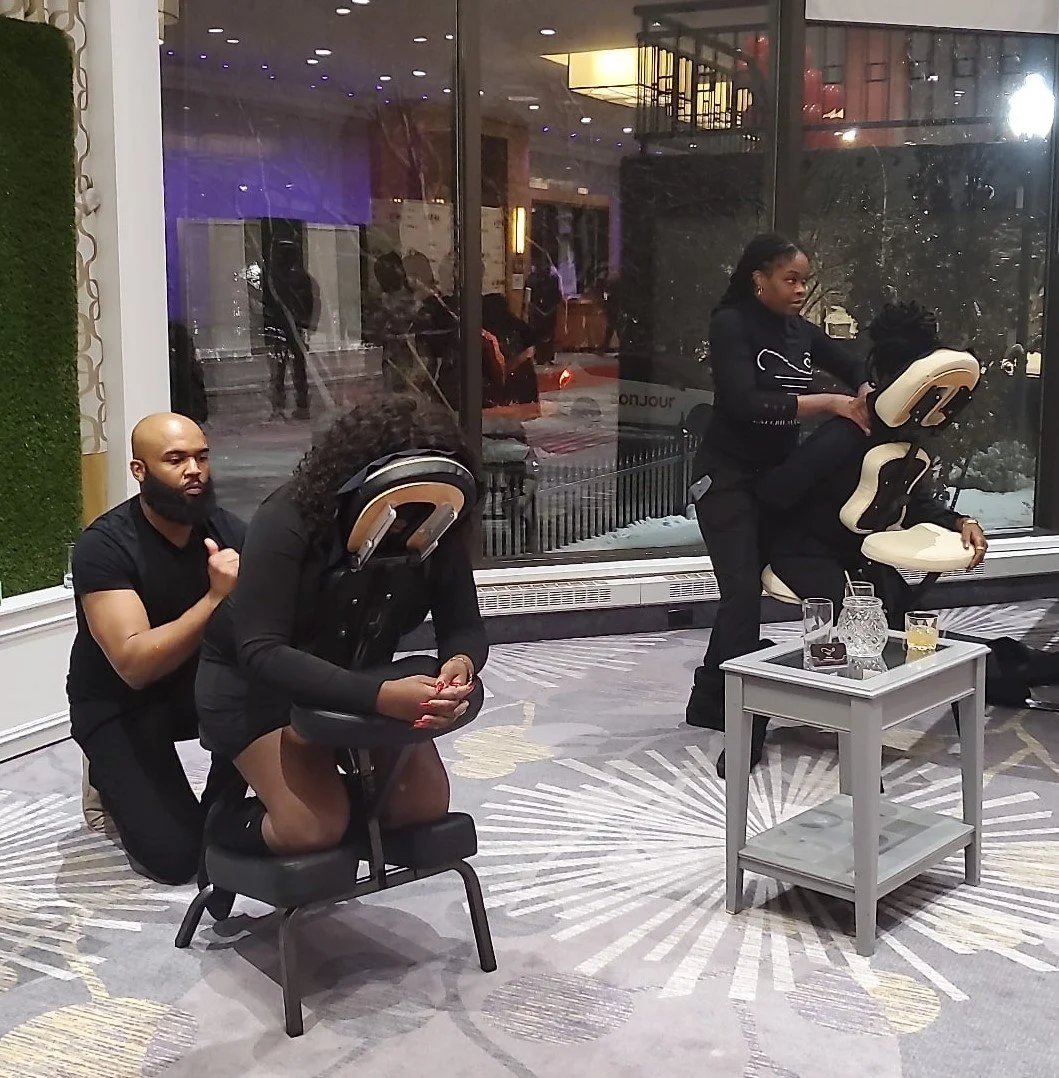 Ce service est parfait pour ajouter une touche unique à votre réception de mariage. Lorsqu’il sera l’heure de vous laisser aller sur la piste de danse, 2 de nos massothérapeutes arriveront avec leur chaise de massage pour vous permettre ainsi qu’à vos invité(e)s de profiter d’un petit moment de détente entre quelques danses. Notre service de massage sur chaise en événementiel saura ajouter un effet ''WOW'' à votre soirée et la rendra encore plus magique et inoubliable.