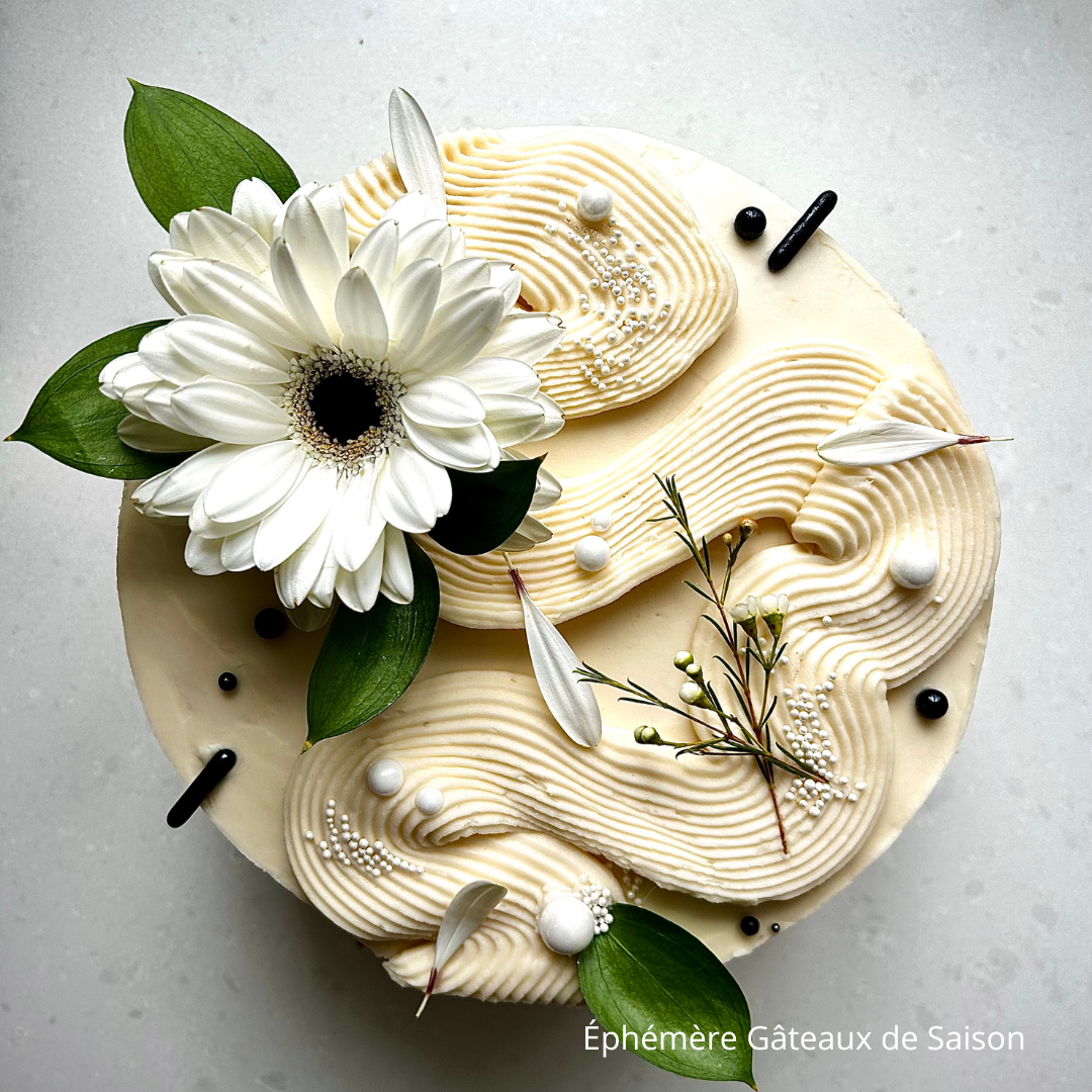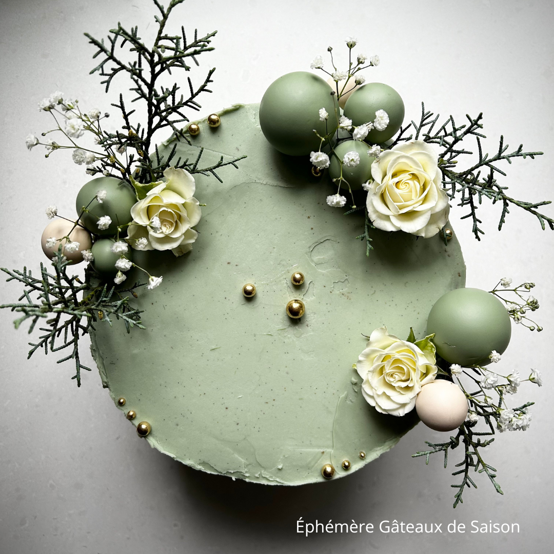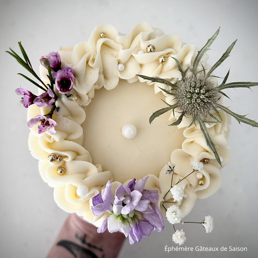 "Chez Éphémère Gâteaux de Saison, nous nous spécialisons dans la création d'oeuvres exquises où la beauté des fleurs rencontre l'art de la pâtisserie.